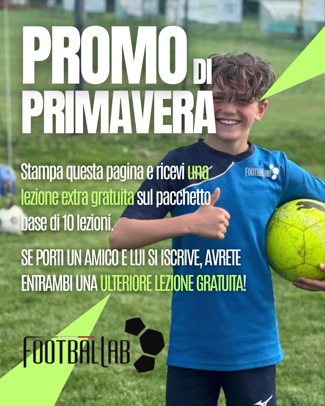 Promo di Primavera!!! Allenati di più, vinci di più! Stampa questa pagina e ricevi 1 lezione extra gratuita sul pacchetto base di 10 lezioni. E non finisce qui: se porti un amico e lui si iscrive, avrete entrambi una ulteriore lezione gratuita! Non lasciarti sfuggire questa occasione: più allenamento, più crescita, più divertimento! Ti aspettiamo a FootballLab Cesena. |